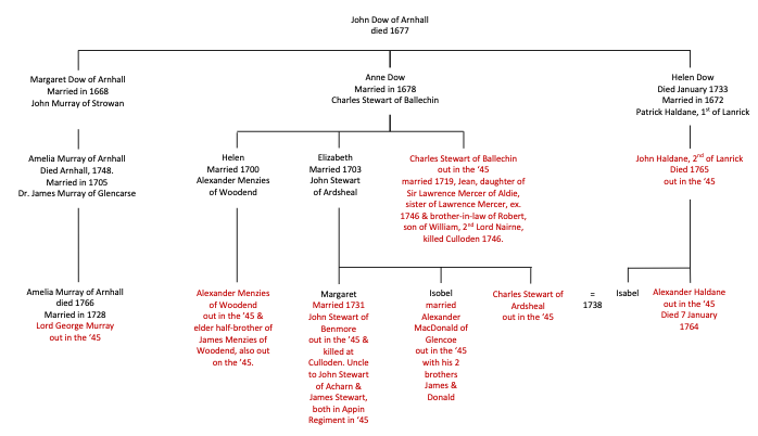 Analysis of even a small snapshot of officers in the Jacobite army of 1745 reveals a complex web of close inter-relationships. The chart below is an example of relationships via three of the daughters and heiress of John Dow of Arnhall, near Stirling. Those in red were “out” in the rising and comprise some of its well-known individuals, including Lord George Murray and Charles Stewart of Ardsheal. Also noteworthy is the geographical scope which is throughout Highland Perthshire over into Appin. To this could be added a considerable number of other officers who were all at least first and second cousin, uncles, in-laws etc., to one another. The question is to what extent, if any, did such near degrees of relationship contribute to their participation in the ’45? This wasn’t unique to the Jacobite era and that faction; out of the near 70 persons charged with the murder of Queen Mary’s favourite, David Riccio, at Holyrood in 1567 at least 3/4 were either in-laws or first or second cousins.